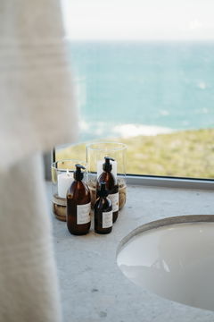 The villa has direct access to ‘Die Plaat’ Nature Reserve and is near the village of Gansbaai for supplies, including many excellent restaurants, golf courses and wine farms to visit. The village is also famous for great white shark viewing. The sun sets right in front of the property and provides a daily spectacle. This is an ideal spot to relax, read or write a book and rethink your life and love